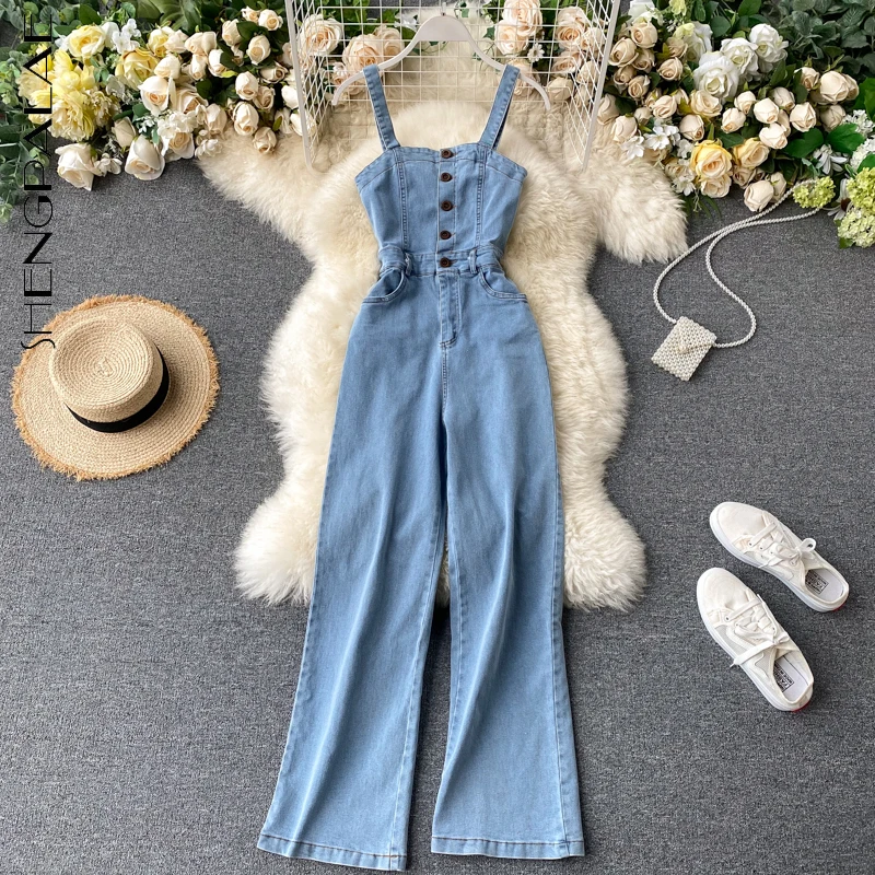 Name: SHENGPALAE-Mono vaquero informal para mujer, tirantes de tubo Sexy, Color azul, Retro, Color sólido, novedad de verano 2021, QV25205